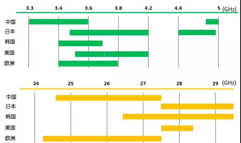 目前,3.5GHz(3.3~4.2GHz)和28GHz(24.25-29.5GHz)频段全球最热门。