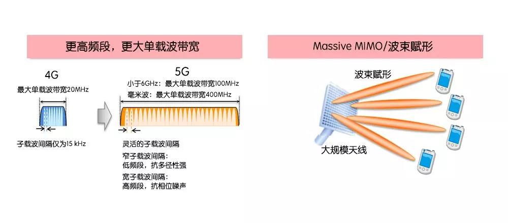 在速率上,5G主要依靠增大单载波带宽提升,并通过Massive MIMO技术进一步提升网速和增强覆盖。