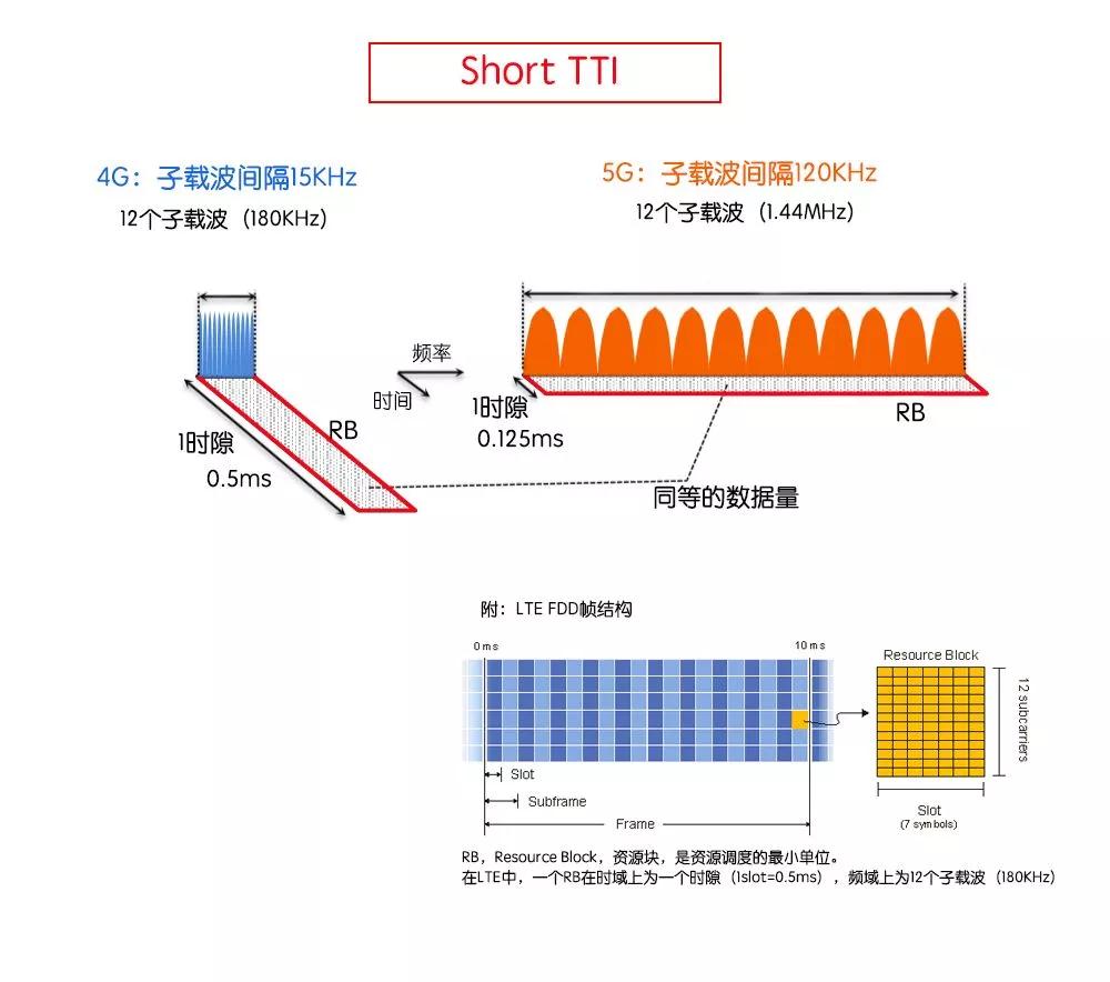 比如,Short TTI,即缩短每个传输时间间隔,通过增加子载波间隔,可以在更短的时间传输等量的数据。