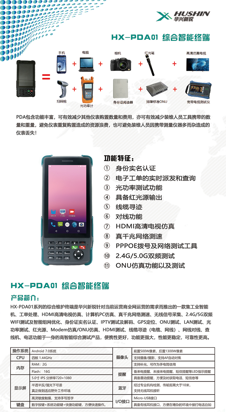 HX-PDA01系列的综合维护终端是华兴新锐智能针对当前运营商全网运营的需求而推出的一款集工业智能机、工单处理、HDMI高清电视仿真、计算机PC仿真、真千兆网络测速、无线信号采集、2.4G/5G双频WIFI测试及智能组网优化、身份证实名认证、IPTV测试及解码、GPS定位、ONU测试、LAN测试、光功率测试、红光源、Modem仿真/ONU仿真、DMM测试、线缆寻迹(电缆、网线)、网线对线、查线..